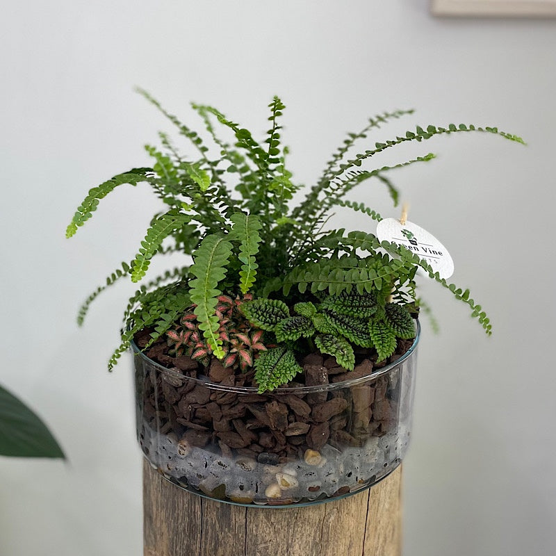 Clear glass bowl / Pot Size 242.5cm W x 9.5cm H / Lush Indoor Plants