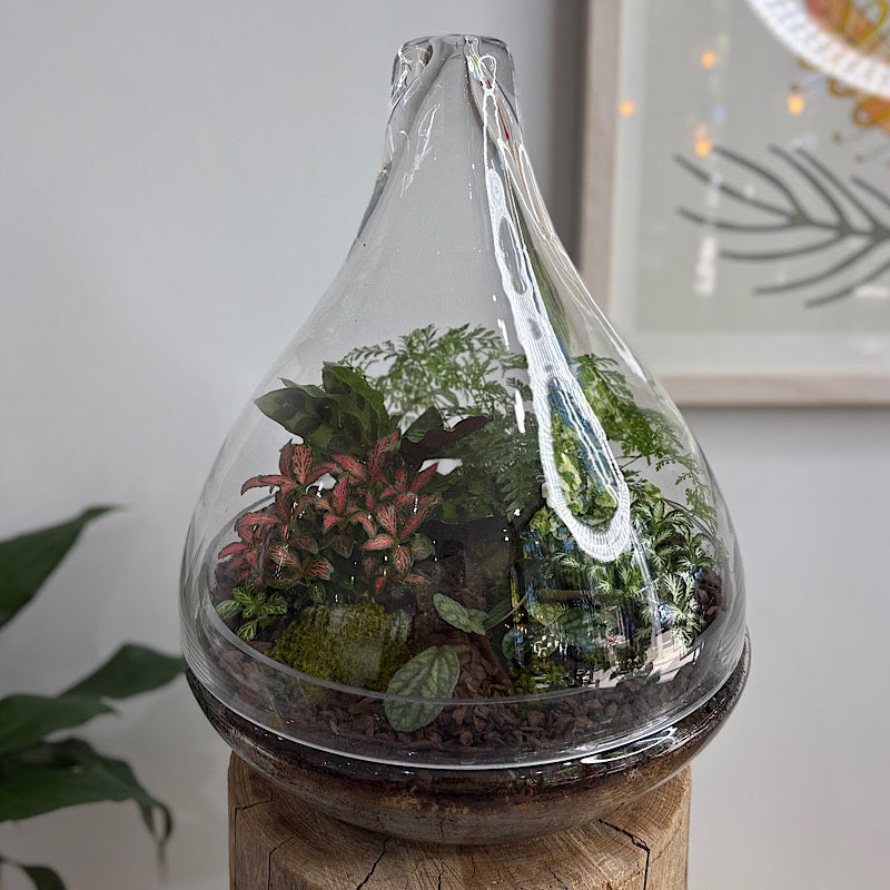 This stunning terrarium features a beautiful range of vibrant and lush plants suitable for a well lit indoor position.