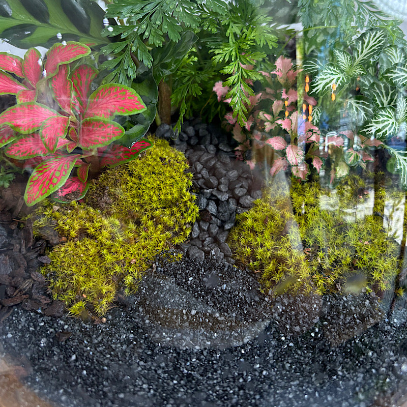This stunning terrarium features a beautiful range of vibrant and lush plants suitable for a well lit indoor position. As a closed terrarium, moisture will condense on the glass so it requires very little watering.