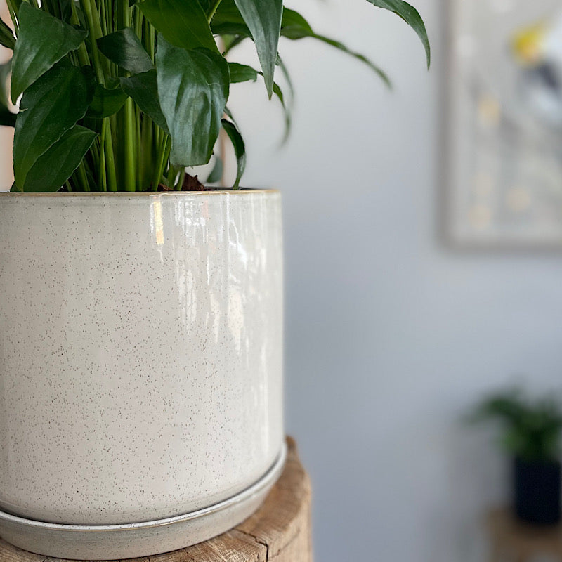 The Oslo Pot is the classic combination of form and function. A beautifully simple stoneware planter with a hole in the base for drainage and matching saucer. Here it is paired with the iconic Peace Lily. With glossy large green leaves and beautiful white flowers, they are one of the most famous indoor plants and for good reason.