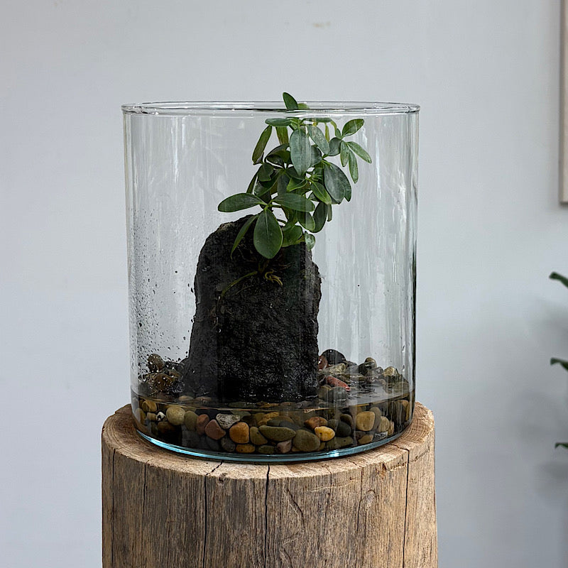 An easy care Umbrella tree that is growing on a volcanic rock. The water in the base simply needs topping up when dry. A striking desk or feature plant.
