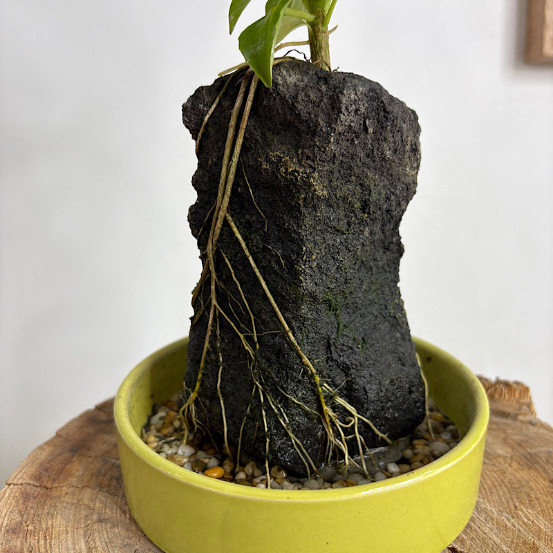 An easy care Umbrella tree that is growing on a volcanic rock. The water in the base pot simply needs topping up when dry. A striking desk or feature plant.